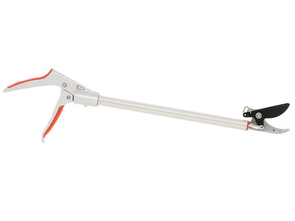 Avec Avec perche en aluminium de 60 cm à coupe orientable, avec robuste poignée également en aluminium, et sécateur avec système Cut&Hold.