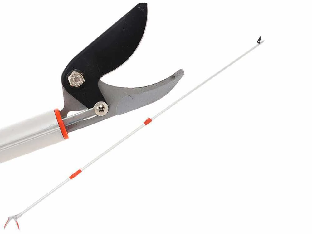 SUPER LÉGÈRE, seulement 1,1 kg. Avec perche en aluminium télescopique de 180-300 cm à coupe orientable, robuste poignée également en aluminium, sécateur à lame revêtue de teflon et coupe Bypass.