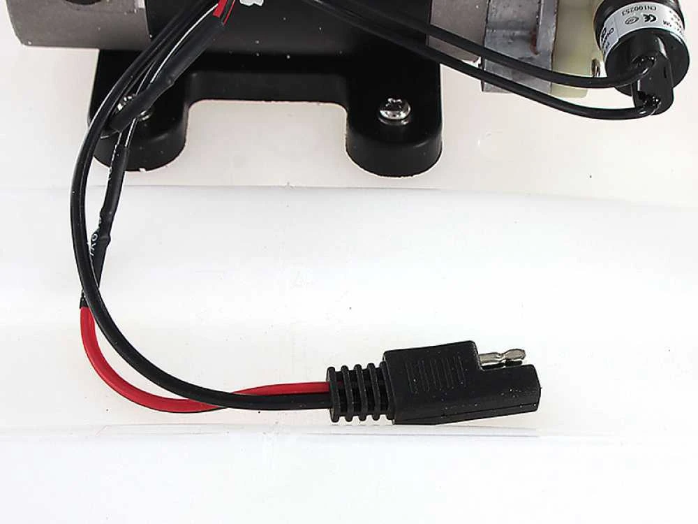 La pompe de pulvérisation électrique s’adapte à toutes les remorques pour autoportées. Il faut seulement brancher les câbles à la batterie de l’autoportée pour l’alimentation de la pompe.