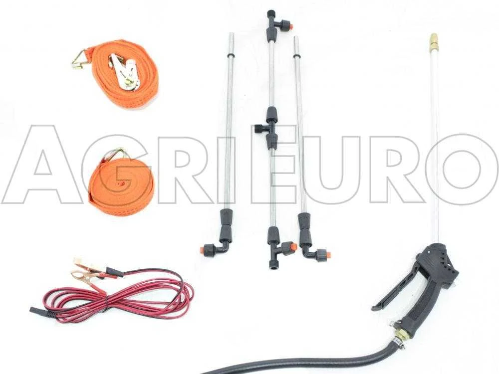 La lance manuelle qui équipe l’appareil est dotée d’une barre en acier inox très résistante et buse en laiton de type professionnelle. La rampe de désherbage est dotée de 4 buses, allégée par la matière en aluminium, et équipée de raccords de jonction en plastique. Celle-ci se démonte facilement pour le remisage pour en réduire l’encombrement. Celle-ci est équipée par un flexible de connexion direct vers la pompe. Il reste seulement le montage de petites barres à l’arrière du chariot ou support où sera placé la cuve, ou même juste à l’arrière d’une autoportée ou quad. Il suffit d’actualiser un simple arrangement pour l’application.