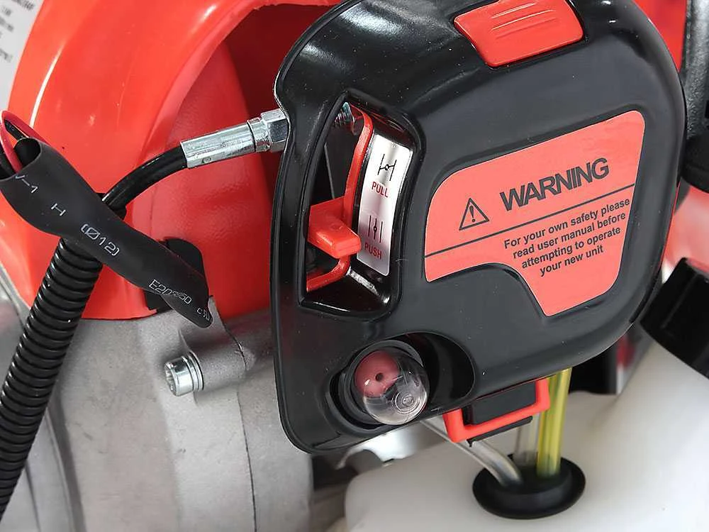 La débroussailleuse s’active très simplement grâce au système de démarrage manuel par tirage avec ressort de rembobinage, à la pompe d’amorçage d’activation à froid (starter) et au réglage de l’air.