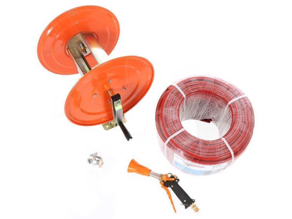 L’enrouleur est conçu pour être monté sur un pulvérisateur où sur d’autres machines. Le pistolet est professionnel et le tuyau à haute pression fait 100 m de long. Le kit contient aussi un raccord en laiton pour la lance et 4 colliers de serrage.