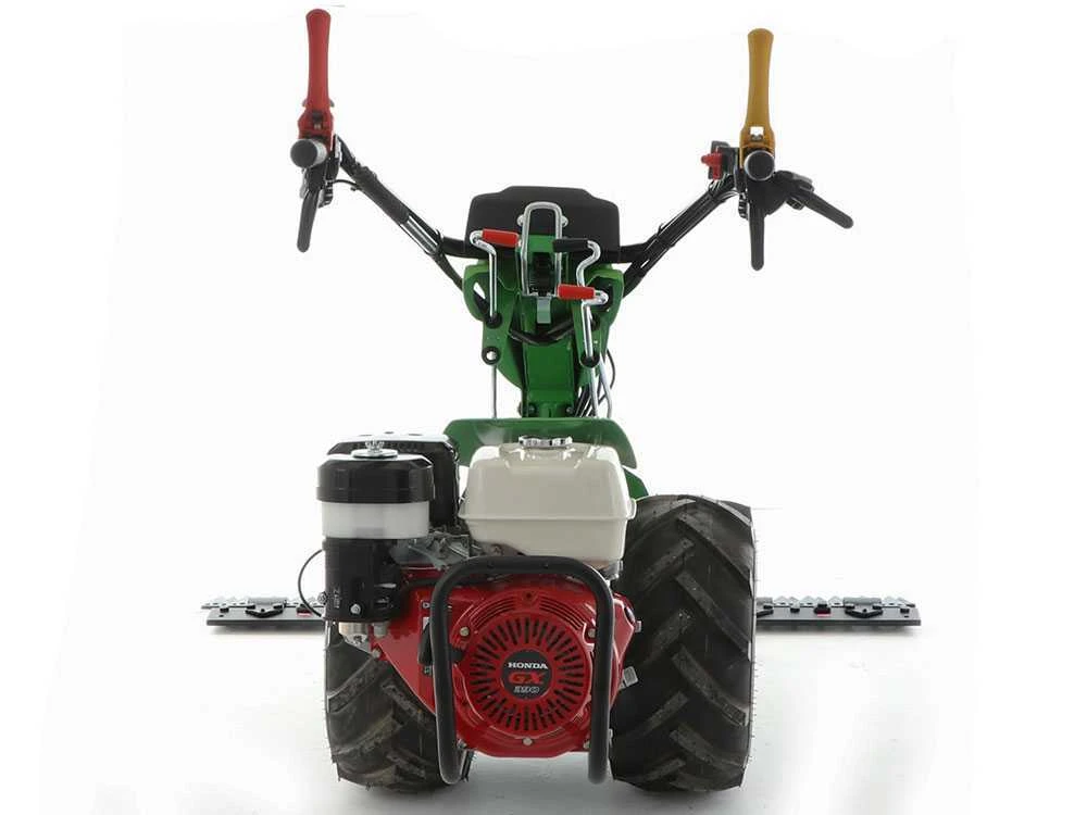 La barre de tonte de cette motofaucheuse est de type basculant. En effet, elle tourne autour de son axe d’attache au corps de la machine. La barre s’attache à la prise de force de la machine par un raccord rapide et est équipée d’une transmission à bain d’huile.