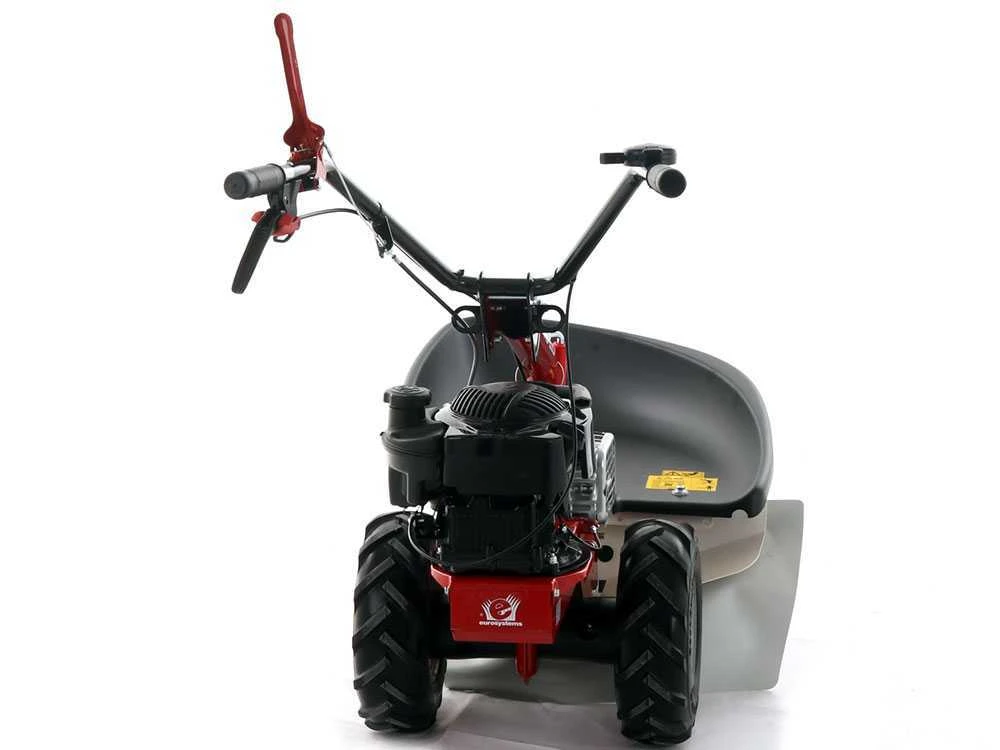 L’Eurosystems RS210 est une faucheuse rotative thermique avec roues pneumatiques agricoles à profil tractor entraînées par une transmission à vis sans fin par bain d’huile.