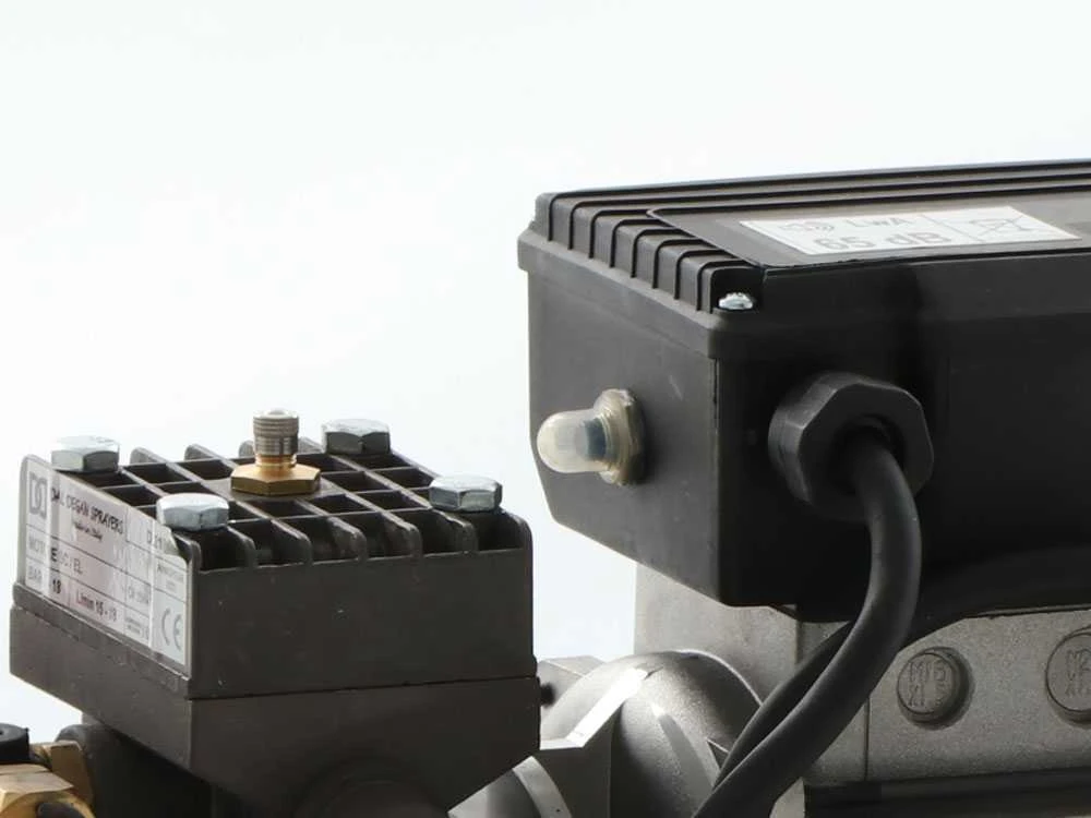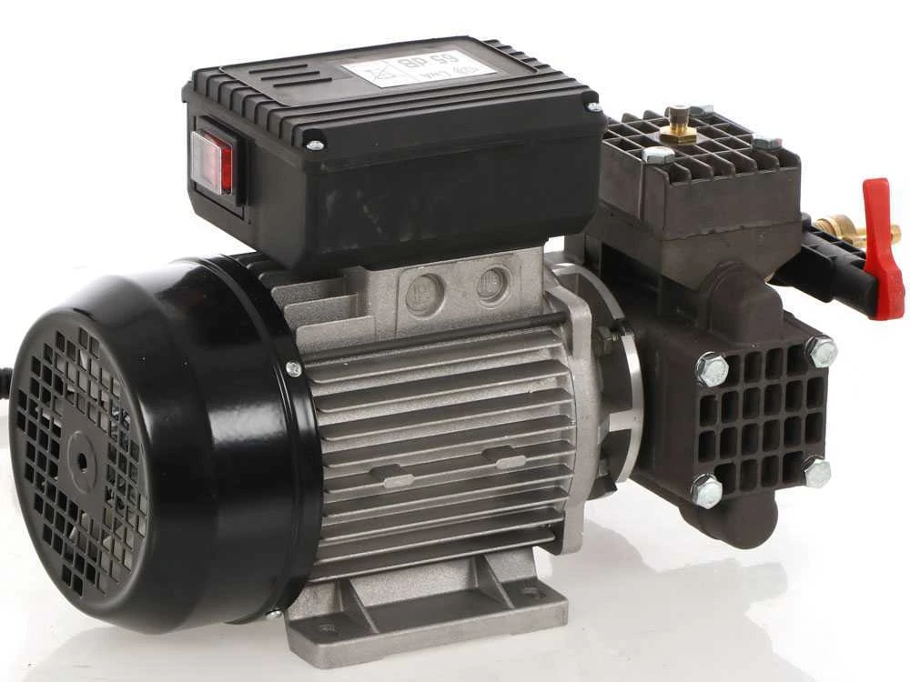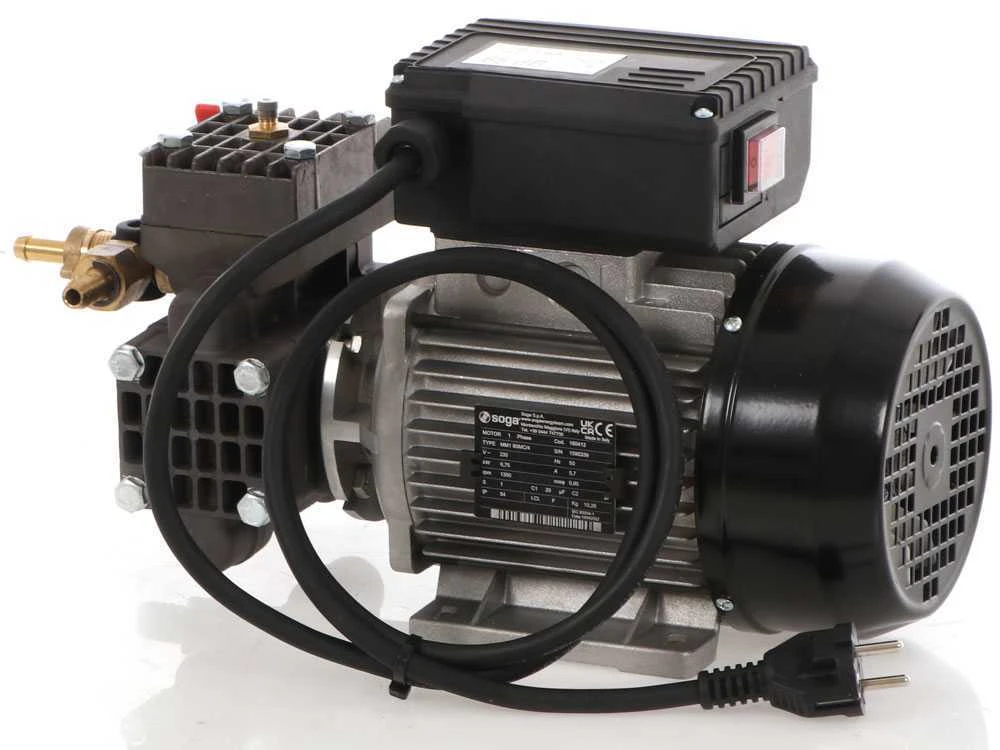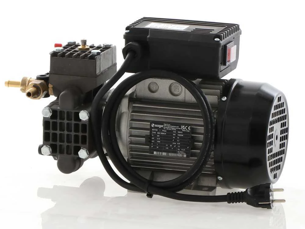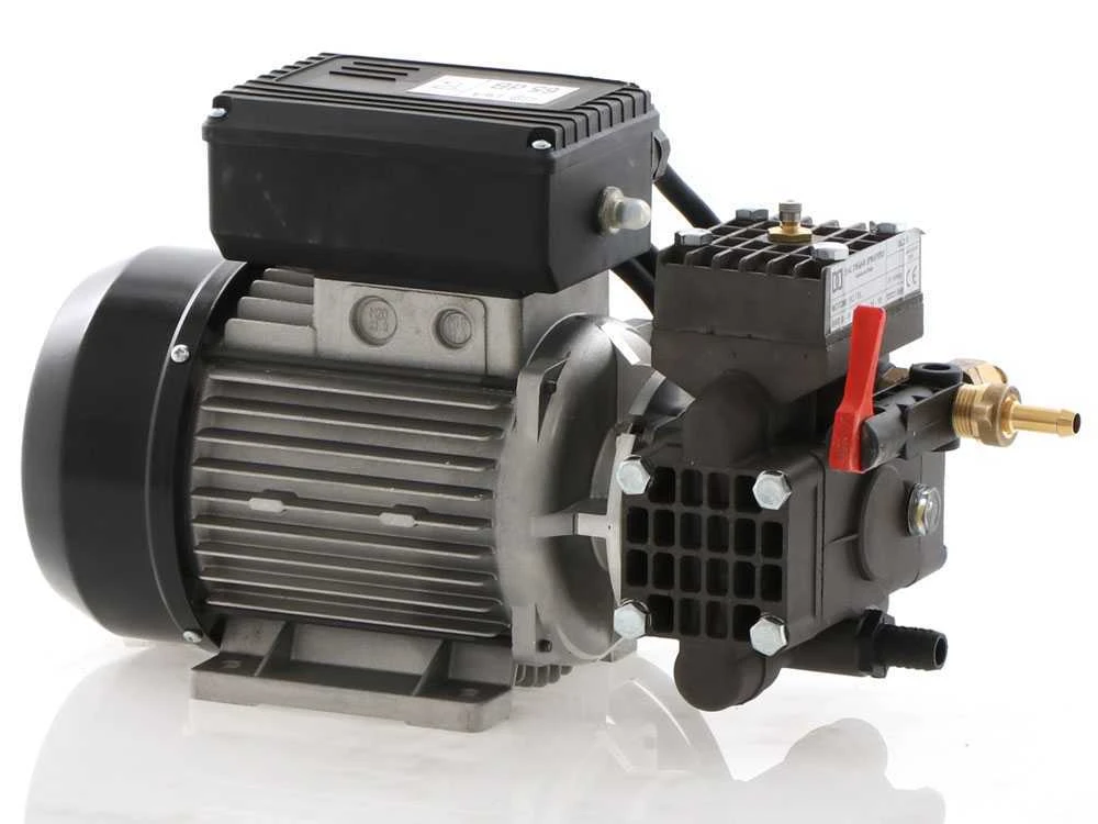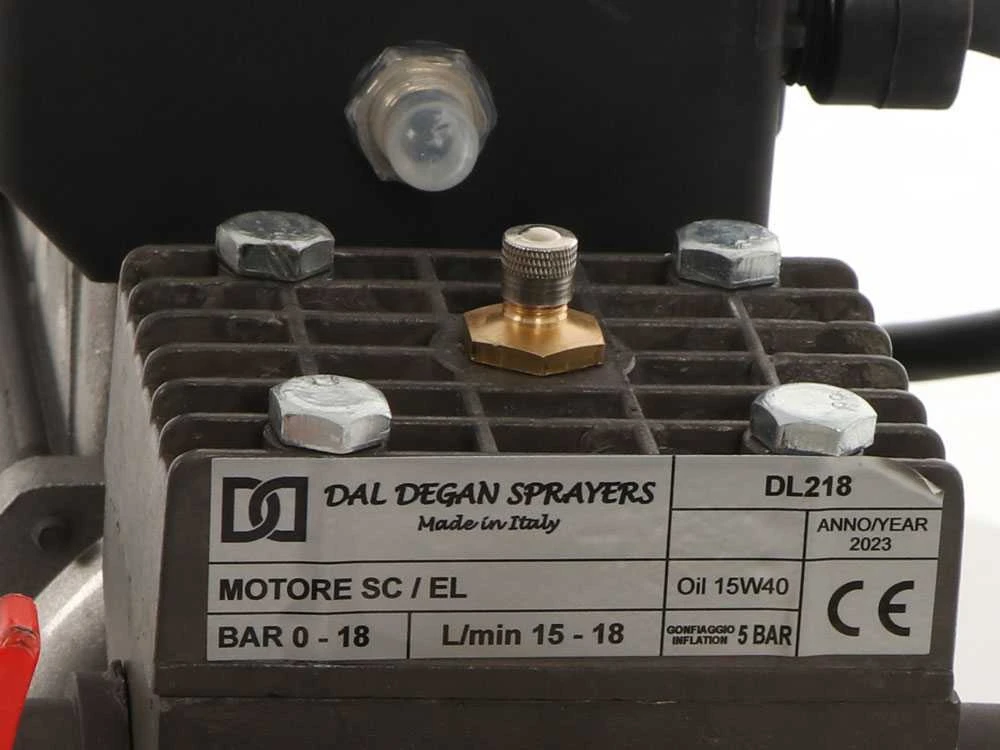 Cette pompe de pulvérisation Dal Degan DL218 à deux membranes, avec corps en aluminium anodisé, est bridée directement au moteur électrique de 1 CV.