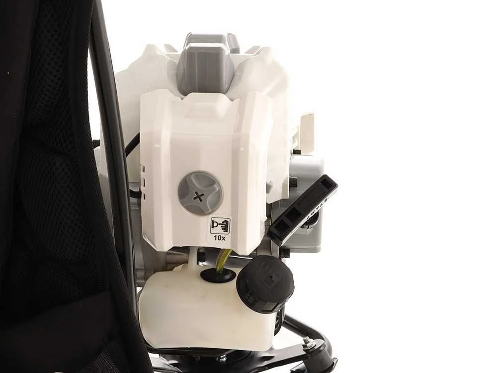 Il se met en route très facilement grâce au démarrage par cordon de tirage avec rembobinage automatique à ressort, à la pompe d’allumage à froid et au réglage de l’air.