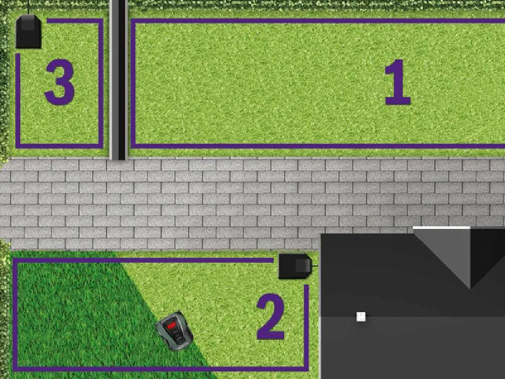 - Fonction multi-zones : cela permet au robot de gérer plusieurs zones indépendantes au sein de votre jardin connectées sur une allée ou sur une bande de gazon, et retourner ensuite pour compléter son parcours.