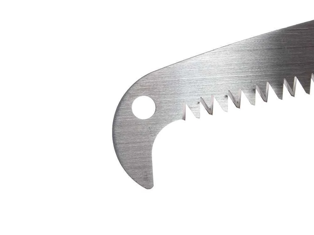Les deux extrémités recourbées, placées aussi bien à la base qu’à l’extrémité plus haute de la lame, permettent de faciliter le travail d’élagage sans relâchement de la branche coupée.