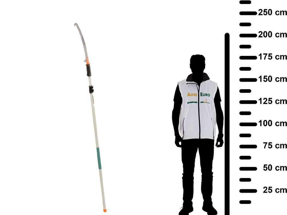 La perche télescopique réglable va d’un minimum (scie incluse) de 230 cm à un maximum de 500 cm.