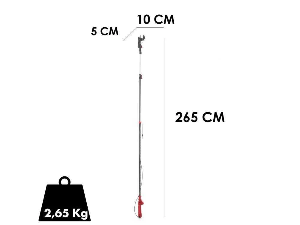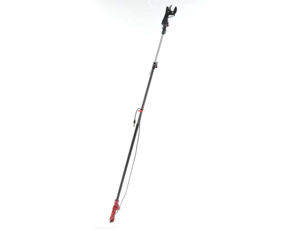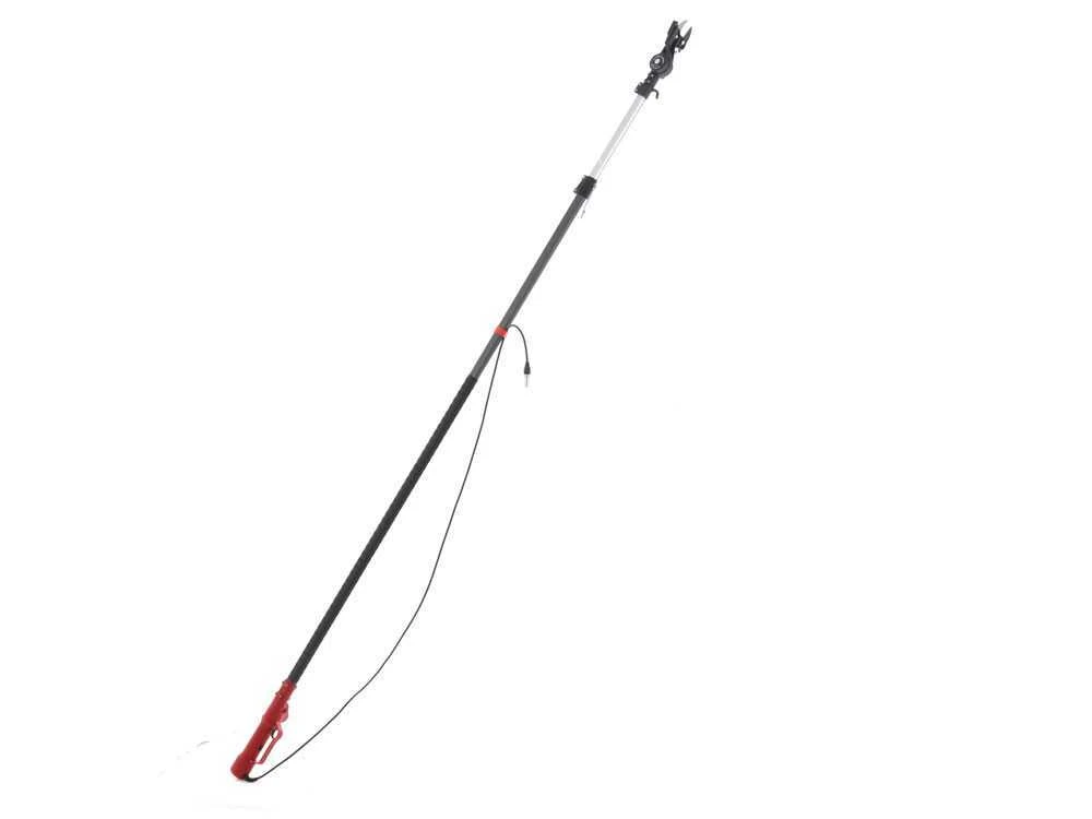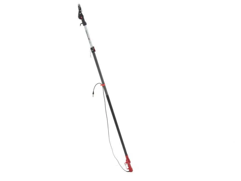 A partir de 265 cm, la tige peut être étendue jusqu’à 415 cm , tout en restant facile à contrôler grâce à sa poignée ergonomique. La gâchette est positionnée sur un espace assez large afin de rendre l’utilisation moins fatigante pour les mains. L’actionnement est assuré par un bouton de sécurité qui, s’il n’est pas directement enfoncé avec la gâchette, n’activera pas le sécateur sur perche. La perche est revêtue en caoutchouc antidérapant qui garantit un travail rapide même en cas de légère pluie.