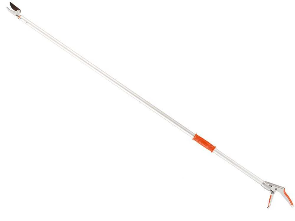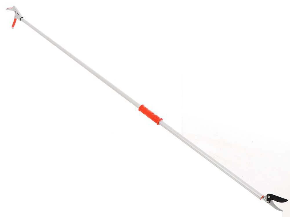 SUPER LÉGÈRE, seulement 785 g. Avec perche en aluminium de 180 cm à coupe orientable, robuste poignée également en aluminium, sécateur à lame revêtue de teflon et coupe Bypass.