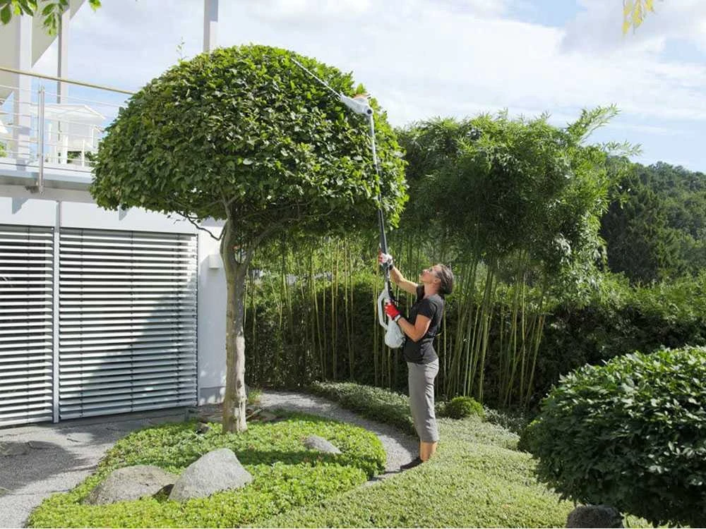 La perche élagueuse est dotée d’une perche extensible qui permet d’arriver même aux branches les plus élevées.