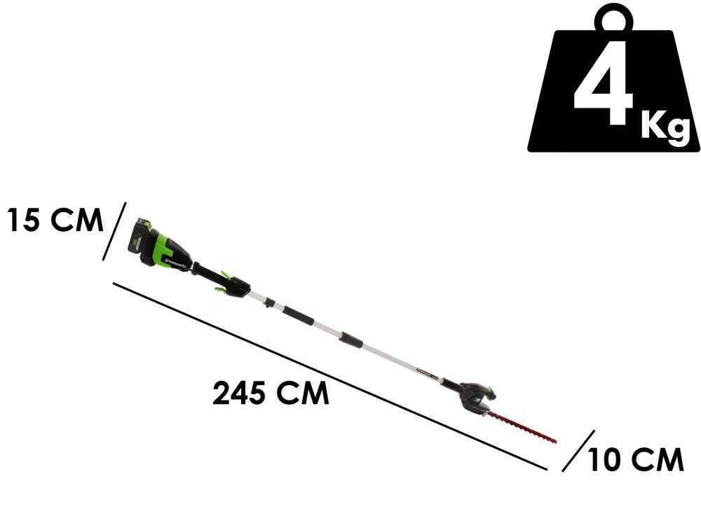 Le taille-haies couvre une hauteur de 247 cm mais peut être démonté afin d’occuper moins d’espace durant le transport ou le rangement.