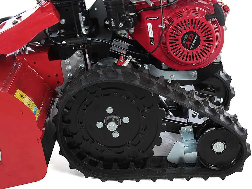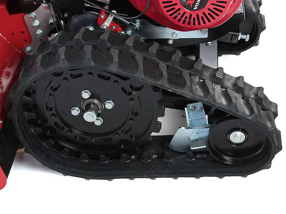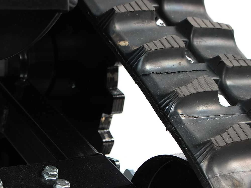 Chenilles: ces chenilles utilisées sont d’une largeur bien supérieure à celle de brouettes à moteur de dimensions égales. La largeur et le profil de la bande de roulement garantissent aux chenilles adhérence et stabilité sur tout type de terrain. Réalisées en caoutchouc spécial renforcé à grip élevé, elles sont capables de faire face à tout type de surface.