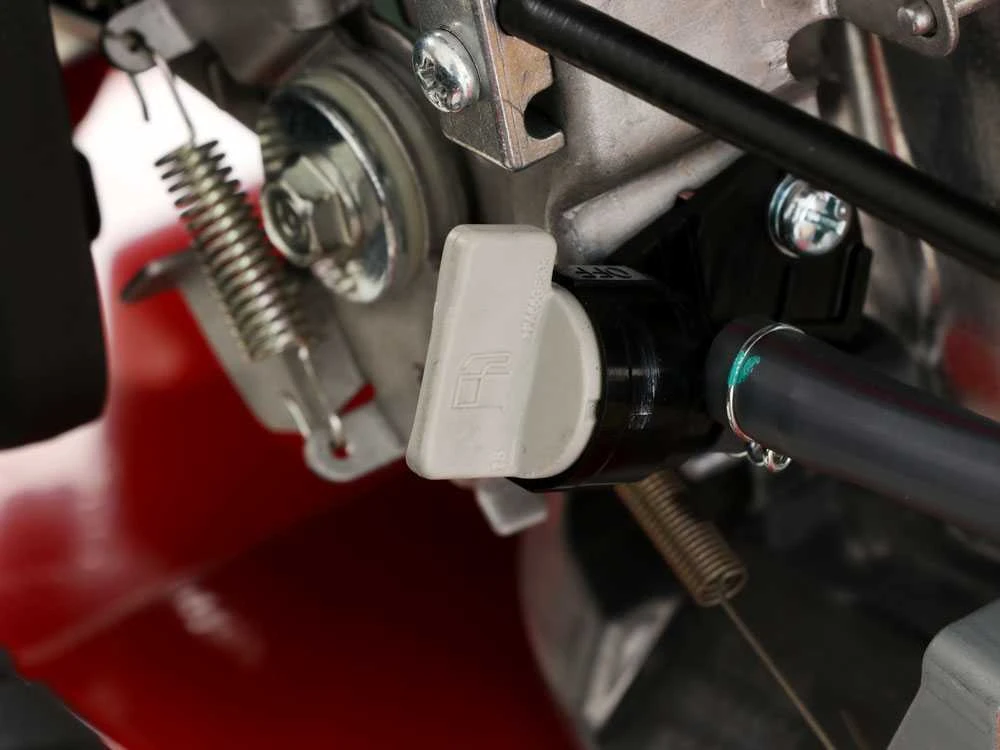 Autre grand avantage du système de transmission par courroie, c’est le levier d’engagement et arrêt de lame. Cet appareil innovant permet d’activer la lame seulement lorsque c’est nécessaire: ceci facilite les déplacements en profitant de la traction à lame arrêtée. Les roues sont d’ailleurs dotées de groupe de traction à engrenages par bain d’huile.