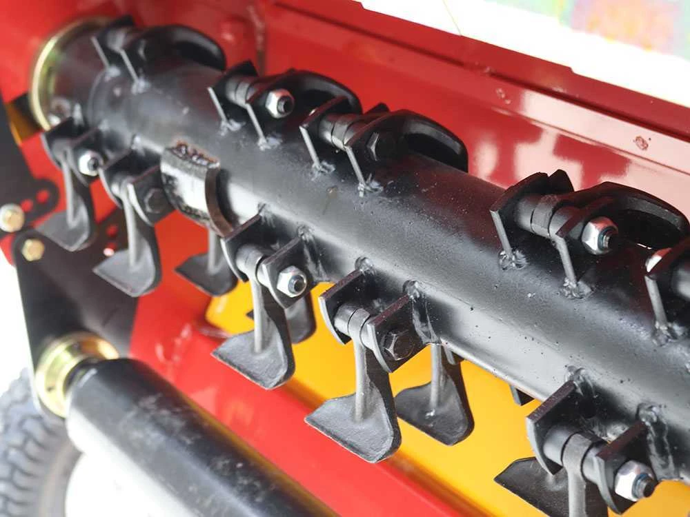 La hauteur de coupe est réglable par le biais des poignées prévues qui réhaussent et abaissent les roues par conséquence également le rouleau de coupe.